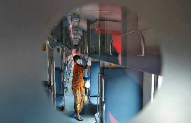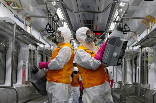 Dezinfekce vlaku v jihokorejském Soulu. Země patří po Číně, Itálii, Íránu a Španělsku mezi pětici států. kde se nemoc nejrychleji šíří. K 26. březnu se nakazilo přes 9 tisíc lidí a 131 zemřelo.