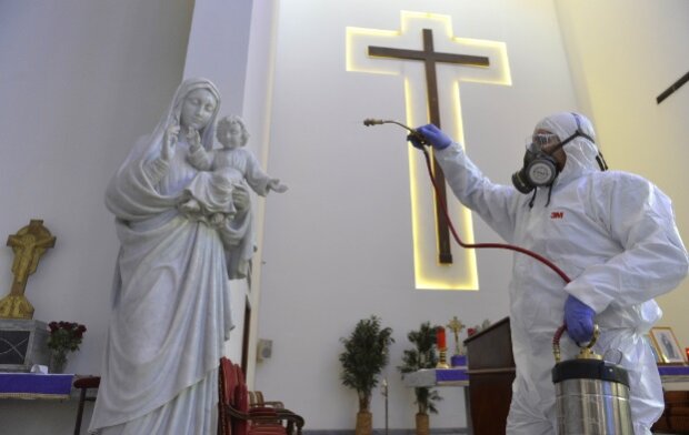 Dezinfekce kostela v Bejrútu v Libanoně. V zemi bylo zatím diagnostikováno 109 případů. Tři lidé zemřeli.