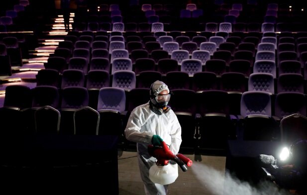 Dezinfekce divadla, kde 7. března proběhla každoroční soutěž pro transgenderové ženy Miss International Queen. Nachází se v thajském městě Pattaya.