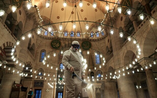 Pracovník v Istanbulu dezinfikuje mešitu Kilic Ali Pasa. V Turecku bylo k 26. březnu evidováno 2433 případů nákazy koronavirem.