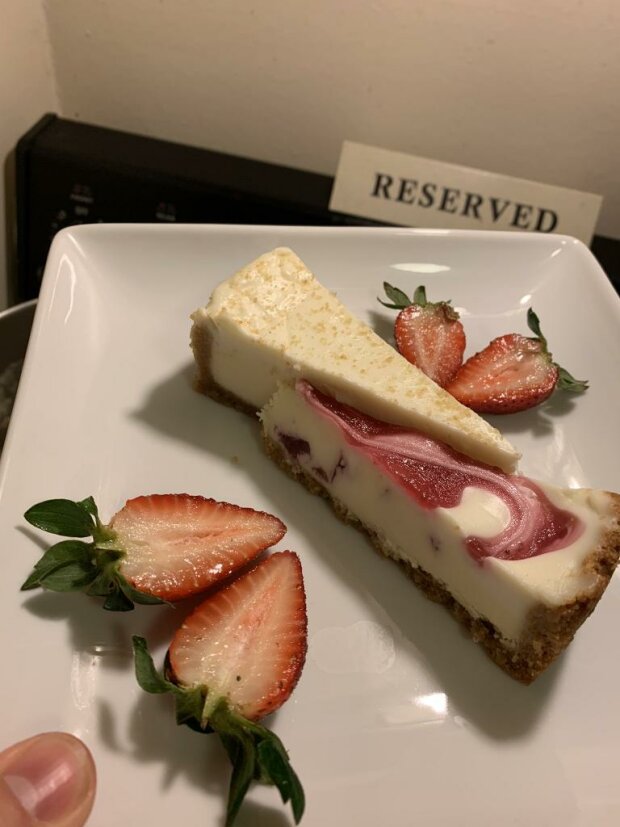 A konečně dezert - cheesecake s čerstvými jahodami. V komentářích muž uvedl, že se nespecializoval na dezerty, takže si musel objednat sladký koláč v cukrárně.