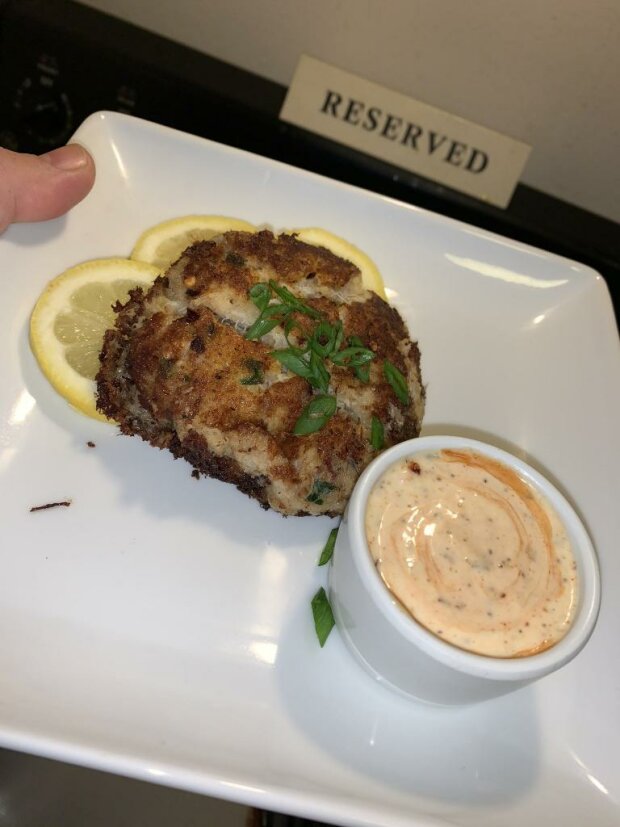 Jako předkrm kuchař nabídl své manželce krabí koláč s francouzskou remuládovou omáčkou.