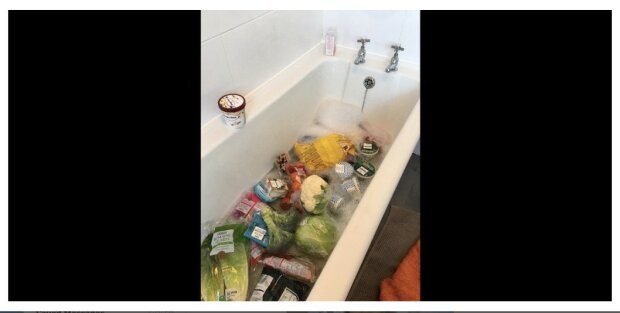 Na fotce zveřejněné na Twitteru jsou řecké jogurty, rajčata, tzatziki, sýr feta, brokolice, jablka Pink Lady a květák. Všechny tyto potraviny si mohly dopřát dlouhou horkou koupel.