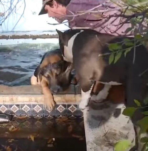 Teď pochopili nervozitu psů. Báli se o svého přítele. Trevor neztrácel čas a vrhl se do bazénu. Naštěstí byl pro muže mělký. Ten rychle chytil zviře a podal ho svému příteli, který zůstal na zemi.