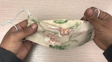 Nejpohodlnější a nejpraktičtější je roušku připevnit tenkou gumičkou. 10-15 cm gumičky provlečte z každé strany a zavažte na uzel. Opakovaně použitelná látková rouška je hotová!