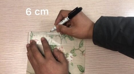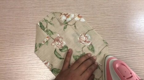 Od rohů si poznačte 6 cm. Ke značkám přiložte všechny čtyři rohy a znovu přežehlete. Vznikne vám trojúhelník, jehož vnější stranu zašijte. Vnější strany nechte volné.