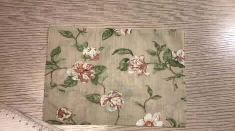Na roušku pro dospělého budete potřebovat plátno nebo bavlnu o rozměru 37x25 cm. Ústřižek přeložte na polovinu a sešijte. Vyžehlete žehličkou, aby se s látkou lépe pracovalo.