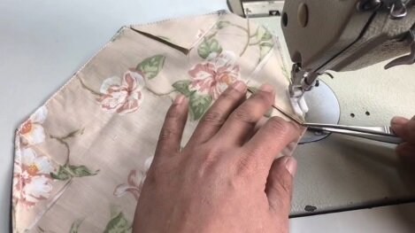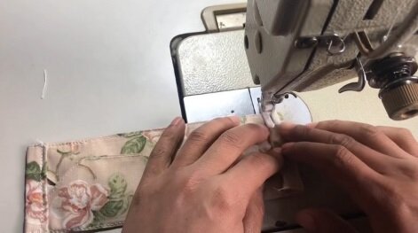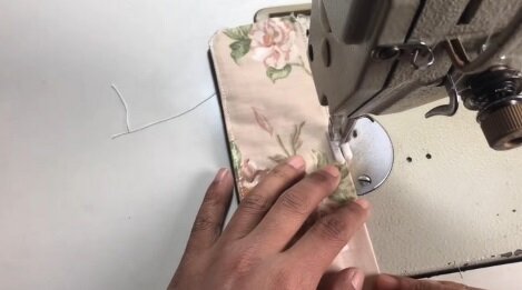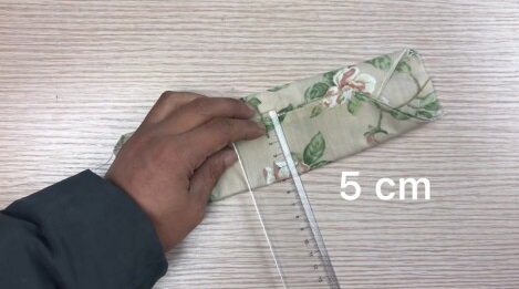 Nejdelší stranu roušky znovu zašijte. Boční stranu 2x přibližně o 1 cm přehněte a také zašijte.