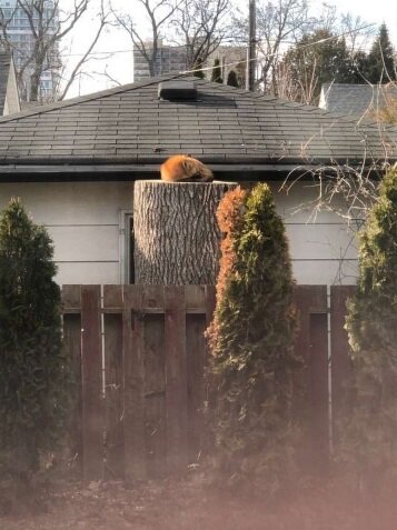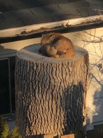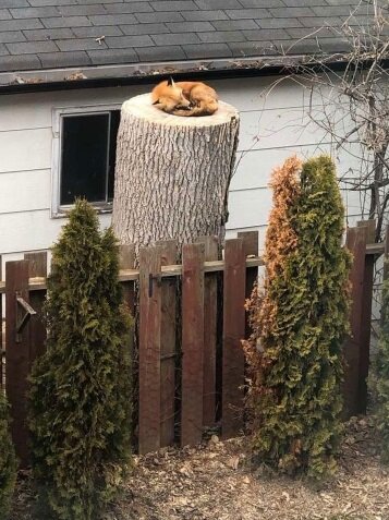 Foto pořídila rodina Sáry Ryanové, která je zveřejnila na Twitteru. Liška pravidelně odchází za svými záležitostmi, ale pak se vrací, aby si zde pospala. Lidí zůstalo ve městě málo, nejsou tu skoro žádní psi, a proto zde lišky mohou pokojně spát. Čím se jí ale tento obrovský pařez místo nory zalíbil, to nikdo neví. Kdosi vyslovil myšlenku, že liška moc dobře ví, o co jde, a dělá to jen na oko. Třeba se příroda takovým způsobem rozhodla ukázat, kdo je ve skutečnosti pán kanadských lesů.