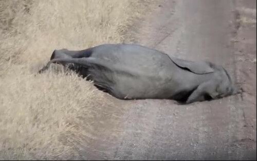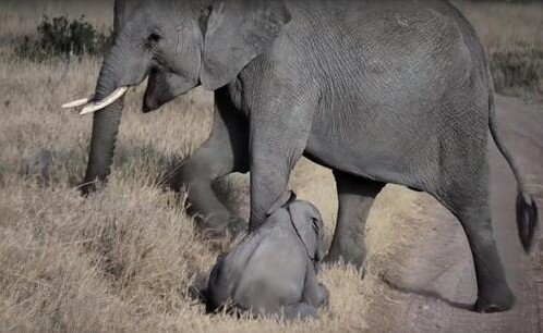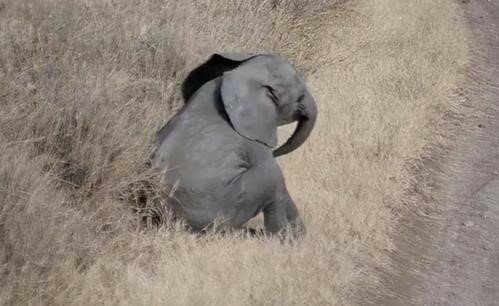 Video bylo zveřejněno ještě v září 2014. Je v něm zachyceno stádo slonů, které přecházelo cestu. Najednou se jedno z mláďat rozhodlo, že už nechce jít dál, a demonstrativně se skácelo do vysoké africké trávy.