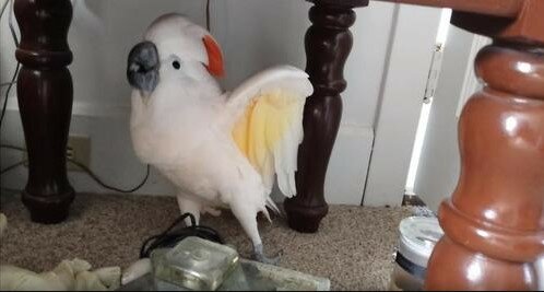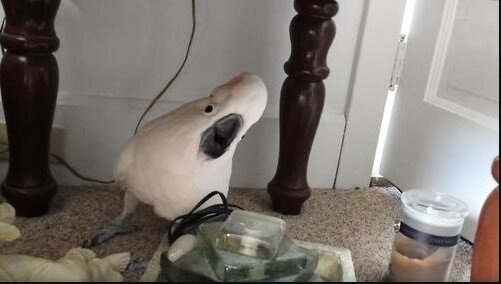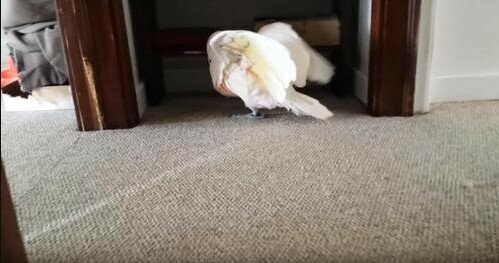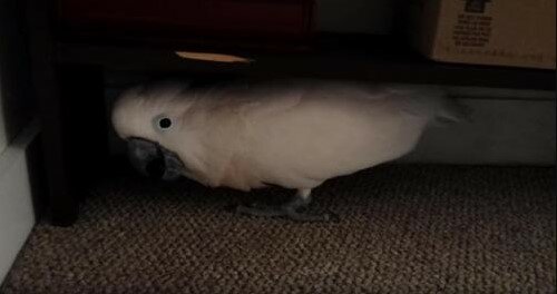 Pak se Max rozhodne schovat pod polici a stále si něco mumlá pod nos. Majitelovy povely samozřejmě jednoduše ignoruje. Takové křiky a mumlání jsou mimochodem v případě kakaduů zcela normální. Pomocí těchto zvuků komunikují, protože nedokážou napodobit lidskou řeč tak dobře jako obyčejní papoušci.