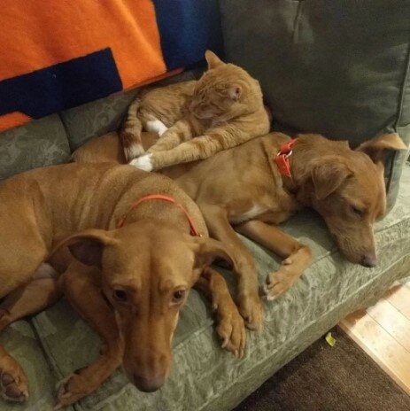 Pětiletou Joule si majitelé před čtyřmi lety vzali z útulku. Soudě podle jejího vzhledu měla mezi předky lovecké psy, konkrétně maďarské ohaře krátkosrsté. Čtyřletý Kelvin se k majitelům dostal také z útulku. Bylo mu tehdy osm měsíců.