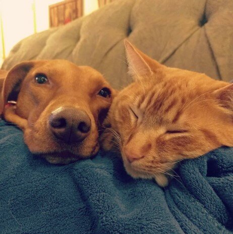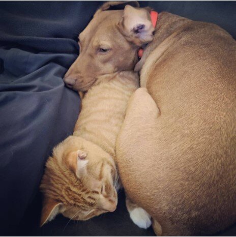 Kocour Kelvin a fenka Joule se k sobě tulí ve spánku, zatímco majitelé nejsou doma.