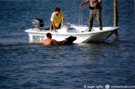 Všem svědkům incidentu se zatajil dech, když Adam táhl medvěda dvacet metrů k pobřeží. Zvíře vážilo téměř dvě stě kilogramů.