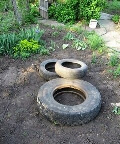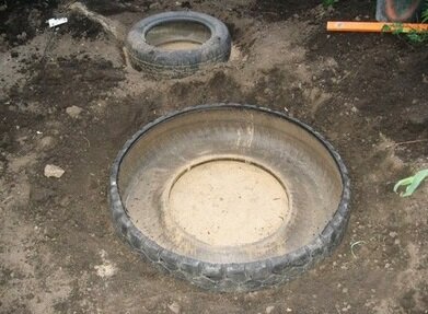 Každou pneumatiku položte na dané místo, namalujte kolem ní kruh, vykopejte tam jámu, aby se do ní pneumatika vešla a vrchní část se nacházela na povrchu země.