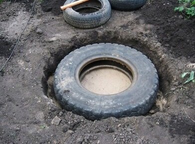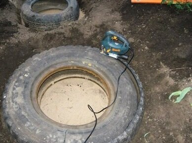 S pomocí ostrého nože nebo brusky pečlivě odřežte vrchní okraj. Konec pneumatiky je potřeba pečlivě zarovnat s povrchem země, aby byl dokonale horizontální. Následně jámu zalijte maltou nebo čímkoliv, co nebude propouštět vodu a postavte do ní pneumatiku.