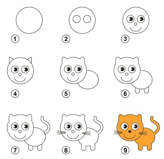 Když budete používat jednoduchá schémata, budete moci namalovat bez chyby jakéhokoliv domácího mazlíčka. Je to zábava, pozorovat, jak se z obyčejných základních tvarů stávají celé obrázky!