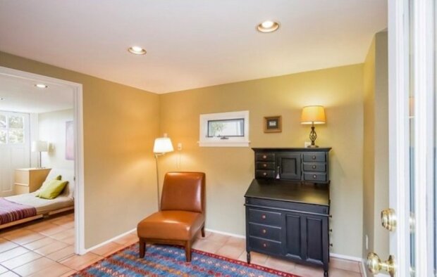 Pokud se podíváte dovnitř, vypadá dům jako malý mezonet, ve kterém jsou dvě ložnice a dvě koupelny, kuchyň a obývací pokoj.