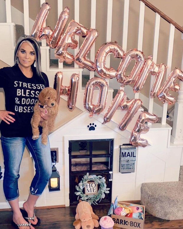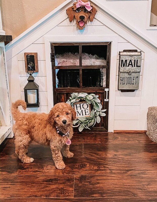 A když se konečně ujali mazlíčka, plemena Goldendoodle, směs pudla a zlatého retrívra, ukázalo se, že nový člen rodiny potřebuje také svůj vlastní koutek v domě.
