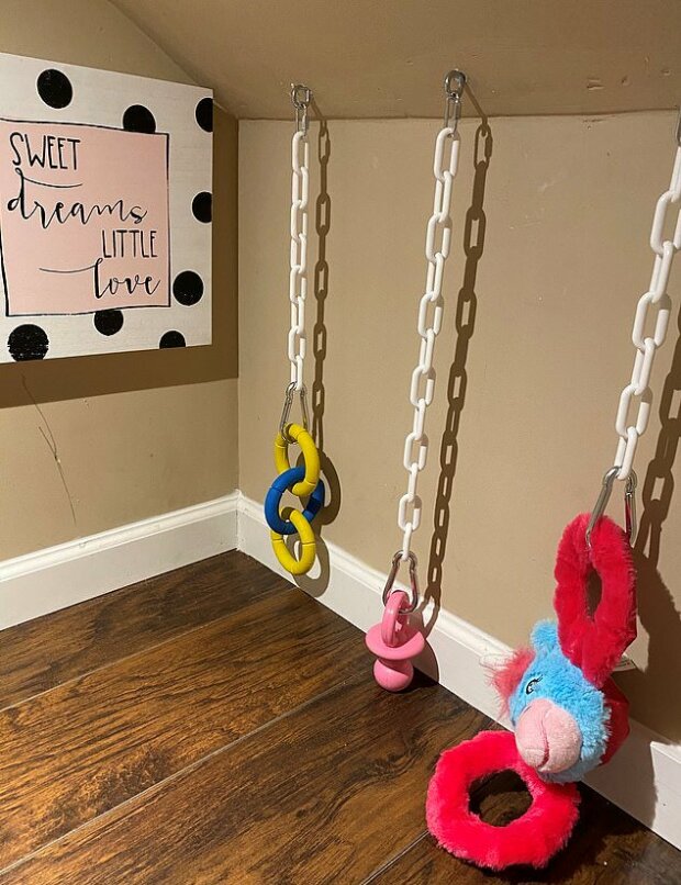 Na zdi visely hračky.