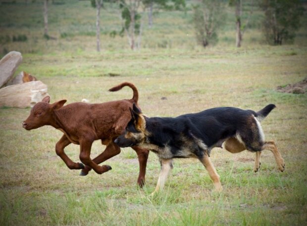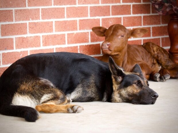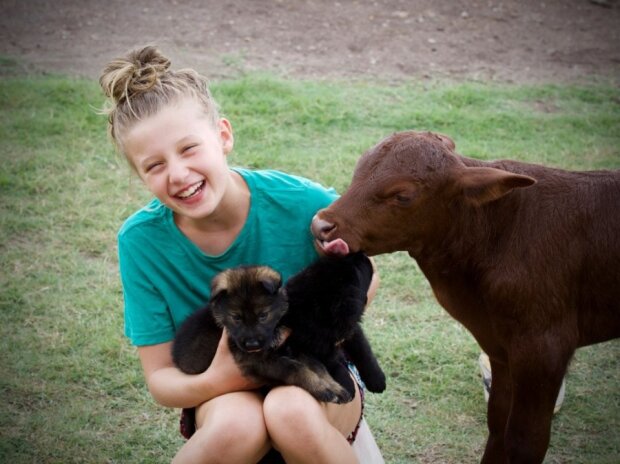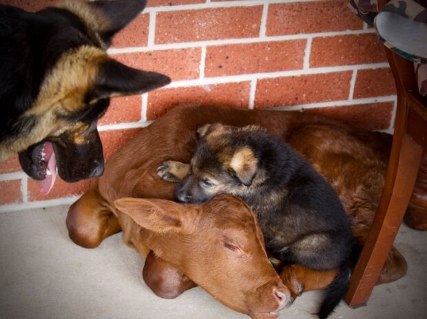 Bade má dva a půl roku a je plnokrevnou fenkou německého ovčáka, starostlivou matkou a laskavou duší. Buddy má 6 týdnů, je sirotkem, majitelé Budy ho vzali domu a dali ho fence na výchovu. Byla jen šťastná a vychovala skutečně dobrého chlapce z telete plemene Santa Gertrudis.