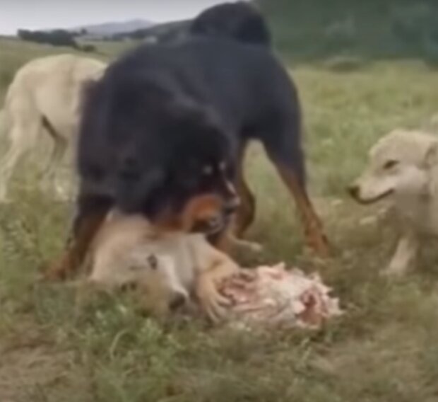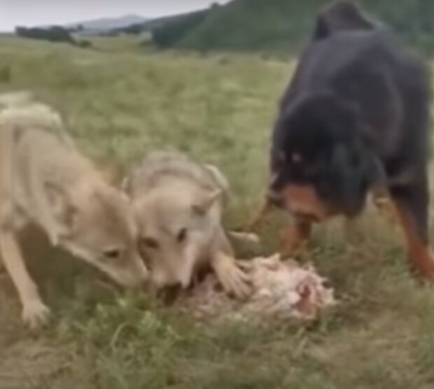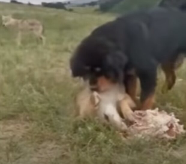 Statečný pes se inspiroval a udivil internet, když se objevilo video, ve kterém pomáhá starému vlkovi jíst svůj podíl kořisti. Ve videu pes plemene, zřejmě tibetská doga, chrání syrové maso, zatímco vlk, který vypadá docela slabě, se ho snaží žvýkat. To vše se děje na pozadí husté vegetací, za níž jsou vidět mohutné majestátní hory. V krátkém videu můžete vidět starého vlka, jak leží na zemi a snaží se jíst. Je zřejmé, že je příliš slabý na to, aby vydržel dlouho. Mladší predátor se pokouší proklouznout blíž k němu a popadnout část masa, ale tibetská doga do toho zasahuje.