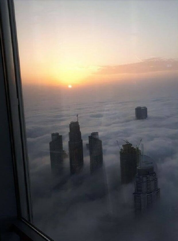 Typický výhled z horních pater mrakodrapu Burž Chalífa. Jeho výška je 828 m a kolem není nic, co by se dalo srovnat s kolosem, dokonce i mraky létají níže.
