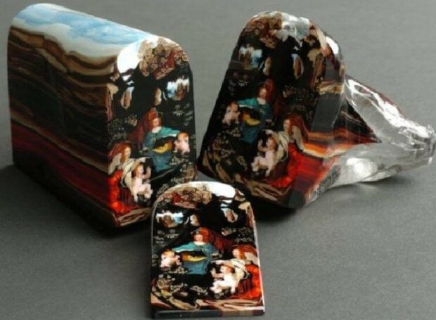 Zvláštní technika lití skla, ve kterém vrstvy na řezu tvoří skutečný obraz. V tomto případě je to" Bohorodička " od Leonarda da Vinciho.