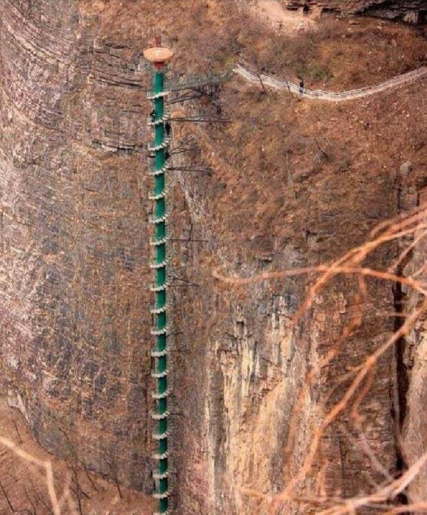 Čína, hřeben Taihangshan, speciálně postavené točité schodiště o výšce 90 m. značně zkracuje cestu, ale ne každý má dostatek síly a odvahy vylézt.