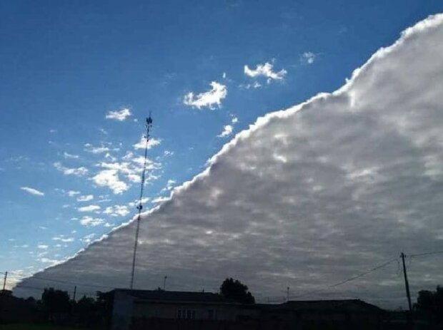 Vlevo azurová obloha, vpravo bouřková mračna, uprostřed zřetelná hranice mezi tmou a světlem