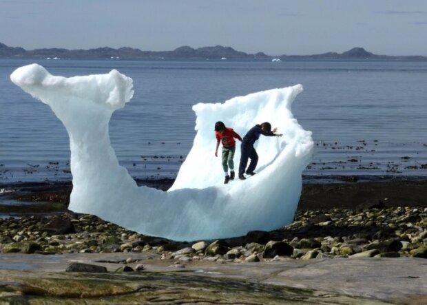 Grónsko před třemi lety. Děti si hrají mezi ledovci na jedné z pláží. Jednou bylo ve sněhu všechno. Ledovce se začaly zmenšovat od konce 70. let. To bylo zaznamenáno díky satelitním fotografiím.