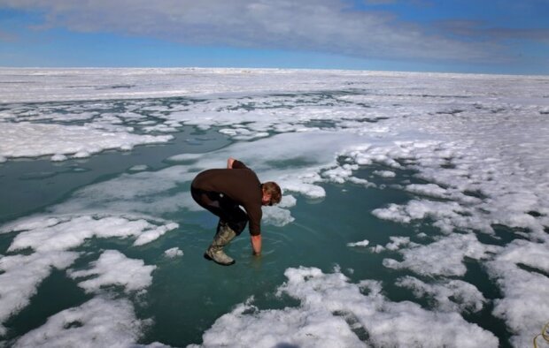 Aljaška znovu. Jeden z vědců ponoří ruku do arktického ledu. Pokud tání pokračuje, dojde ke zvýšení hladiny moře. A to zase povede k záplavám velkého území.