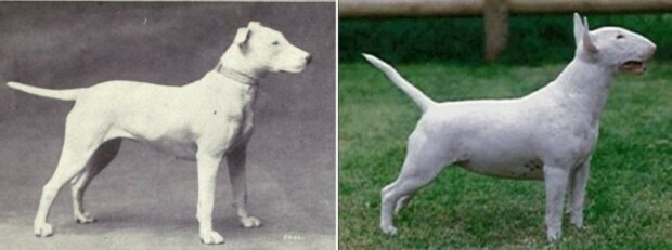 Výsledkem bylo, že počátkem 20. století chovatelé měli jedinec, který vidíte na černobílé fotografii vlevo - docela roztomilý pes. Ale posledních sto let provedlo úpravy a nyní bulteriéři vypadají impozantně a dokonce i hrozivě, zejména pokud jde o hlavu.