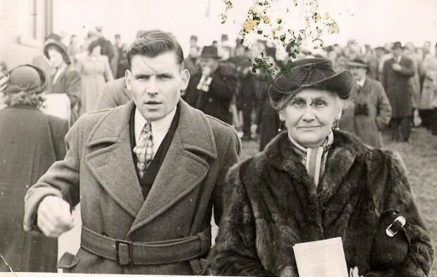 "1940. Můj děda (na snímku je mu 17 let) na dostizích se svou matkou»