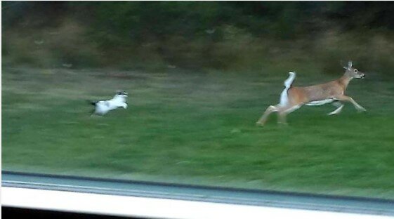 "Krásná půvabná bílá-sledoval jelena ... a naši hloupou kočku, která si ho spletla se sousedním psem."