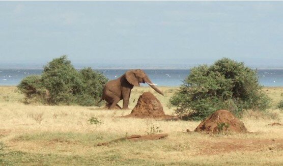 "Nádherný výhled na slona položícího hromadu na mohylu termitů»