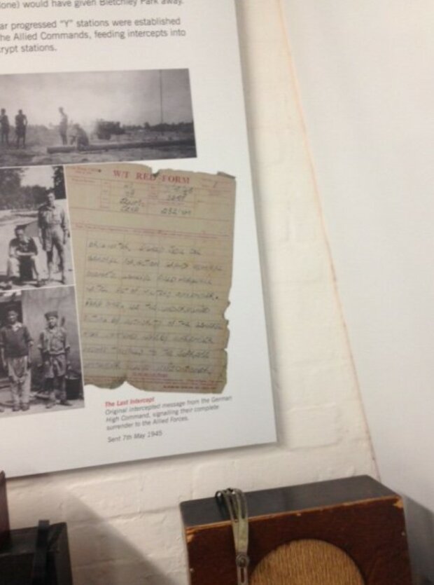 Narazila jsem na tento vzkaz napsaný mým otcem v Bletchley Park Museum. Píše se v ní o kapitulaci Německa. Byl rozhlasovým kameramanem v Beaumanor Hall.