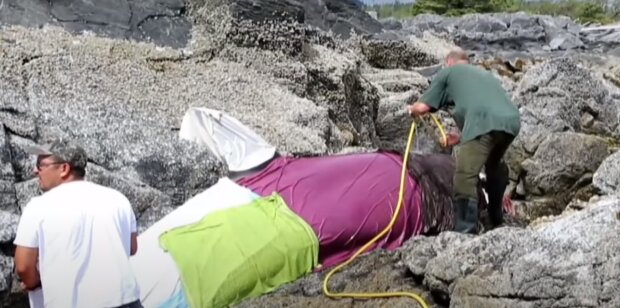 Nebylo možné přesunout kosatku do vody byla příliš těžká a těžkopádná na zemi, nepovedeně uvíznutá mezi ostrými kameny. Museli čekat mnoho hodin na příliv a polévat zvíře vodou. Jak si všimli záchranáři, kteří nahradili rybáře, měla rychlý puls a stav stresu, ale velryba pochopila, co se děje, a nezasahovala.