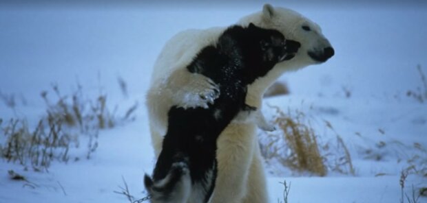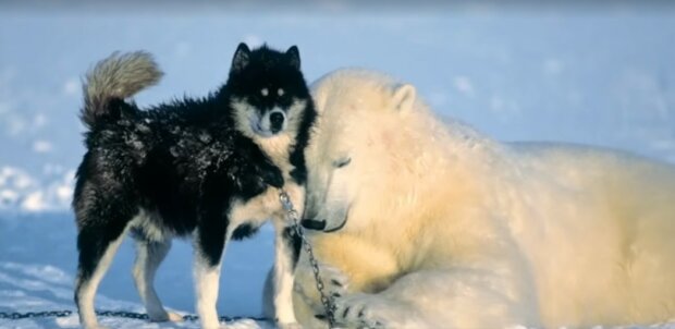 Nevšiml si hned, jak jeho pes na chvíli zmizel z dohledu. V další chvíli se k ní přiblížil obrovský lední medvěd a položil jí na hlavu tlapku. Člověk stál daleko a mohl se jen dívat.