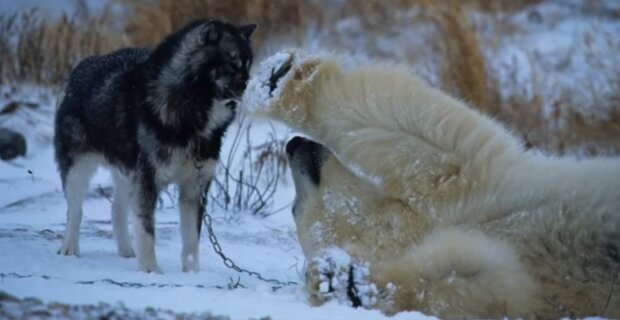 Brian Ladun, majitel husky, doslova zamrzl na místě. Věděl, že husky psy chované na severu se přirozeně nebojí ledních medvědů - proto jeho pes zůstal na svém místě a zvědavě se díval na majitele tundry.