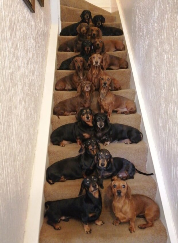 Trvalo mu 8 minut, než na schody pěkně umístil 16 jezevčíků a vyfotil je.