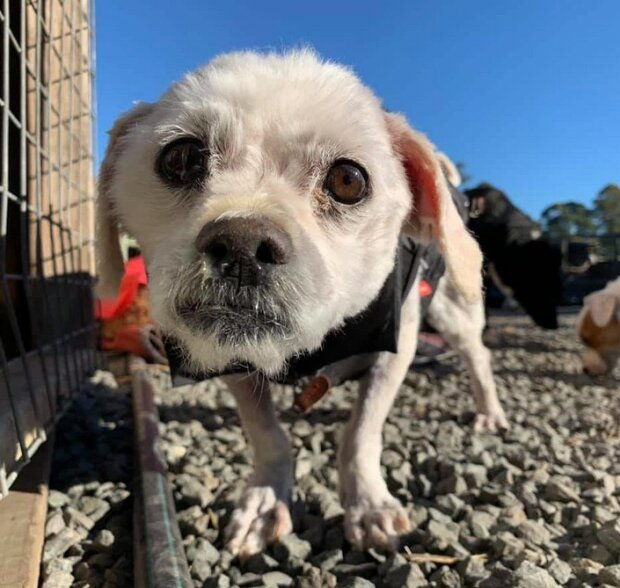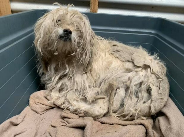 Když ho přivezli do útulku Brightside Farm Sanctuary, v něm bylo těžké poznat psa . Pes byl pokrytý koltunami, byl vyděšený a agresivní.