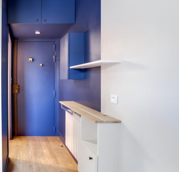 Rozhodli oddělit chodbu od hlavního obývacího pokoje jasnou barvou tmavého stínu. Tím se vizuálně zvětšila chodba i místnost.