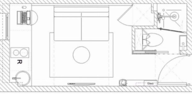 Hlavní obytná část je uprostřed místnosti. K dispozici je rozkládací pohovka a několik polic pro malé věci. WC a sprchový kout jsou vpravo od předních dveří, kde bylo vodovodní vedení pro vodu a kanalizaci. V koupelně je umyvadlo, sprcha a malá toaleta.