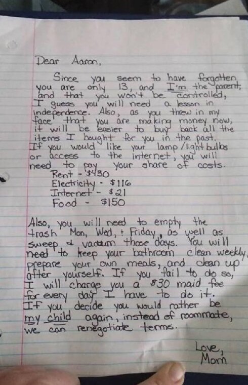 Myslím, že jsi zapomněl, že je ti jen 13 let a že jsem pořád tvoje matka! Ale pokud chceš být tak nezávislý, myslím si, že tato lekce nezávislosti ti přinese užitek! Protože, jak jsi řekl, nyní sám vyděláváš, nebude pro tebe obtížné vykoupit ode mne všechno vybavení, které jsem pro tebe kdysi koupila. Pokud ve svém pokoji chceš mít přístup k internetu, budeš muset zaplatit svůj podíl za účty.