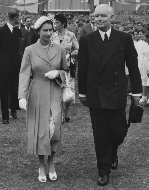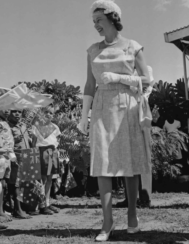Alžběta II. během královské cesty po Austrálii, 1963. Lehké šaty s jednoduchým střihem. Ale sedí velmi dobře a zdůrazňuje všechny výhody postavy.