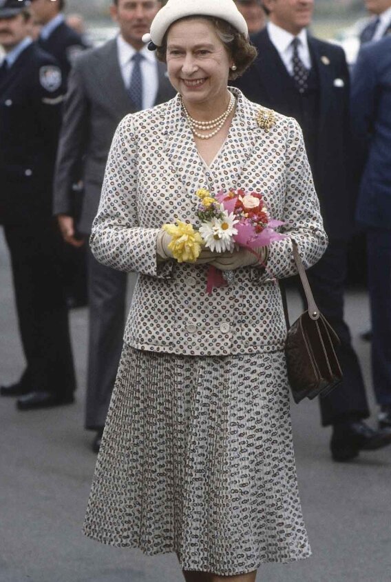 Oficiální návštěva královny Alžběty v Austrálii, 1981. Toto oblečení je již blíže k univerzálnímu stylu. Střih se stává přímějším, což více připomíná královské moderní oblečení.