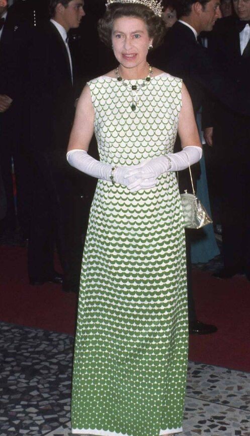 Oficiální událost v Kanadě, 1976. Královna Alžběta v mládí věděla mnoho o luxusních šatech. Tento outfit na nás opravdu zapůsobil. Vynikající bílé šaty se zeleným vzorem. Stojí za zmínku, jak skvěle vybrané šperky a jak harmonicky jsou kombinovány s šaty.