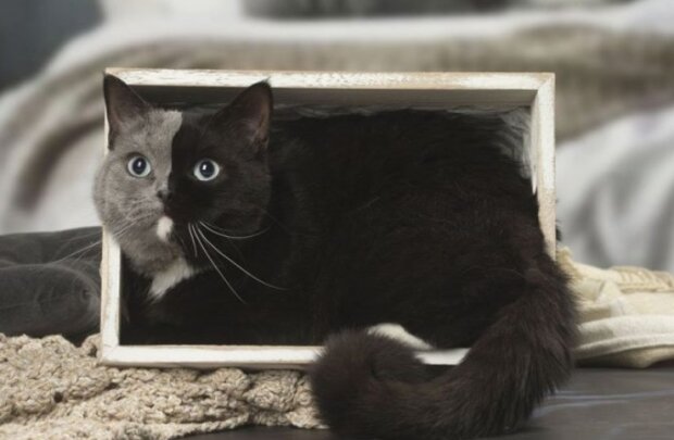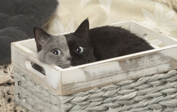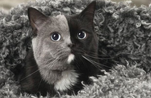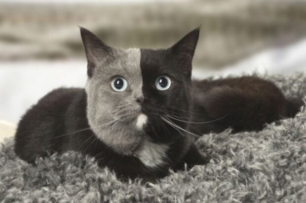 Tvář kočky je přesně uprostřed rozdělena na dvě poloviny, z nichž každá má svou vlastní barvu.