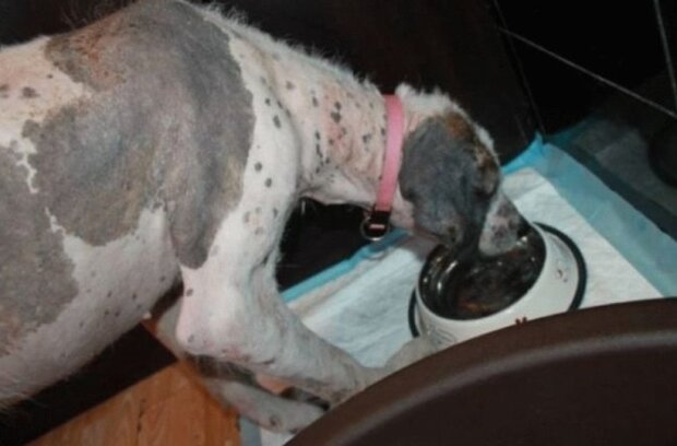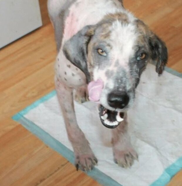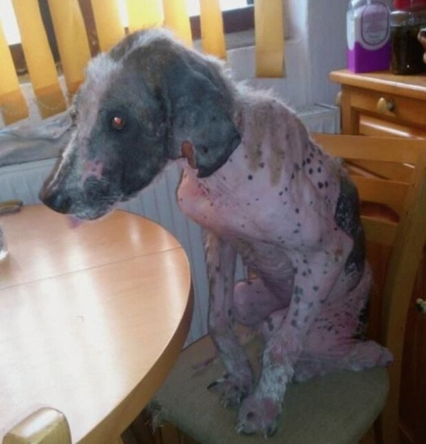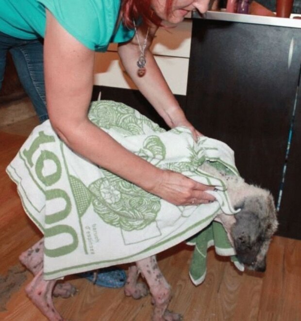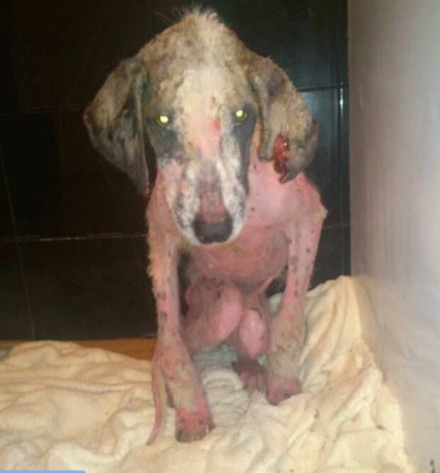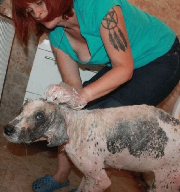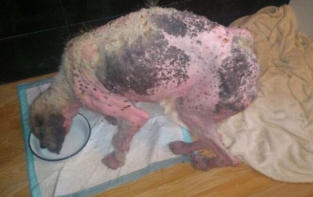 Stav psa byl hrozný. Téměř neměl žádnou srst, byla snědena parazity. Nebuď dobrovolníků, žil by ještě pár dní, víc už ne.